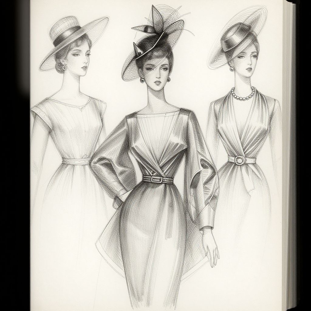 Fashion model sketch displaying vintage haute couture with elaborate hats and accessories, refined cross-hatching techniques, monochrome palette with subtle grey gradients, focus on classic elegance and intricate garment folds in a gallery sketch format.