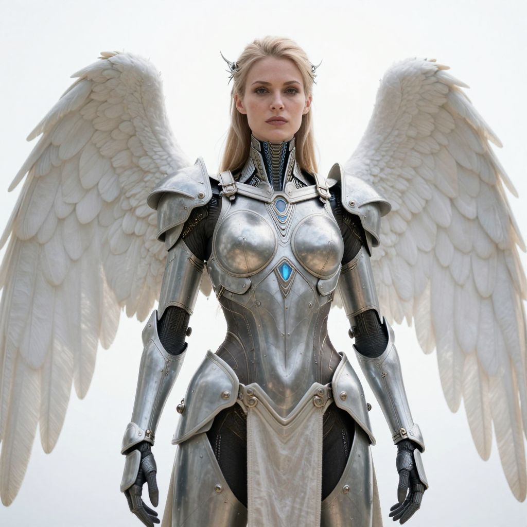 A detailed, futuristic cyborg woman with realistic angel wings, wearing intricate armor, stands with a calm expression against a bright, ethereal background.