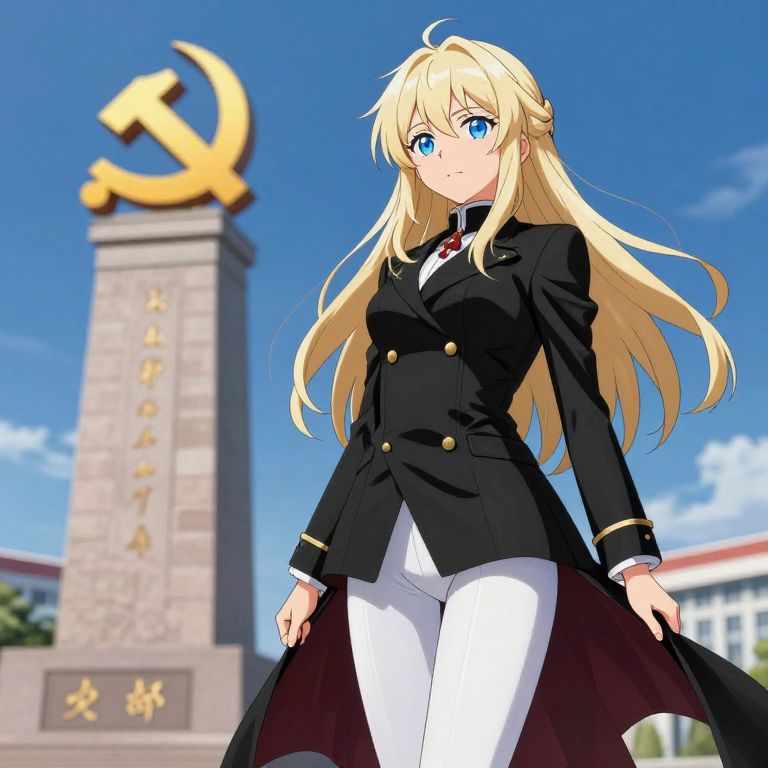 Digital anime-style drawing of a blonde woman with blue eyes, wearing a black military-style jacket with gold buttons, white pants, and a red tie. She has long hair flowing past her shoulders. She stands in front of a monument featuring a golden hammer and sickle emblem, set against a clear blue sky. The monument has Chinese characters and a rectangular base. Her confident expression and stance suggest strength and authority. The background includes a building with red and white elements. The image uses vibrant colors and sharp lines typical of anime art.