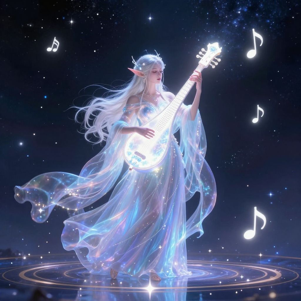 Fantastical elf woman in glowing, ethereal white dress plays illuminated acoustic guitar on starry stage, surrounded by floating musical notes.
