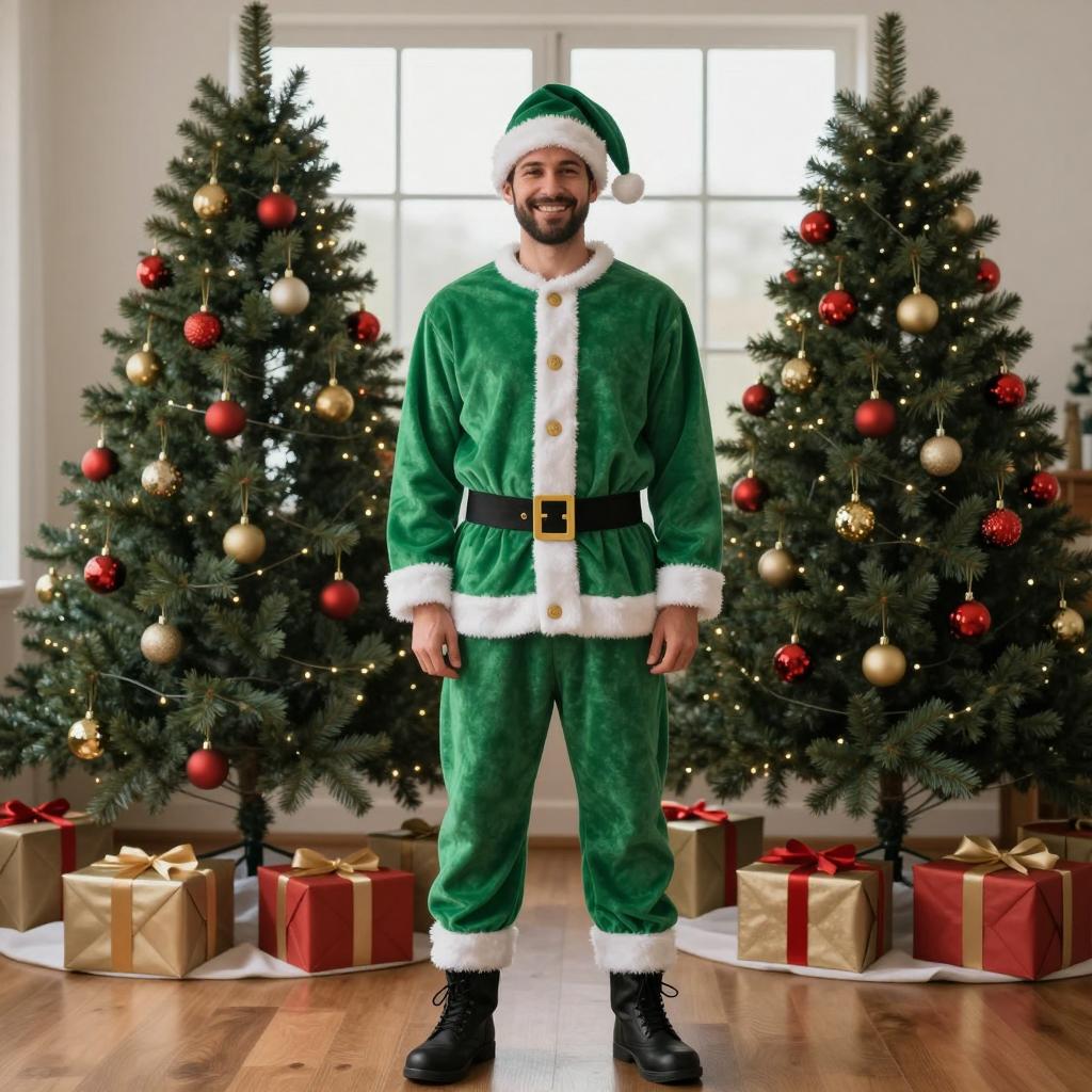 Green costume christmas, photograph of a man standing in front of two decorated Christmas trees, wearing a green Santa Claus costume with white trim, black boots, and a green Santa hat, festive holiday background, daylight through window, red and gold Christmas ornaments on trees, wrapped presents under trees, hardwood floor, full body shot, smiling, centered in frame, realistic lighting, cozy indoor setting, warm colors, Christmas theme, festive atmosphere