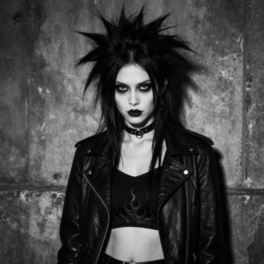 Gothic woman with vivid red spiky hair, black makeup, and spiked black top, in a dimly lit, abandoned building. Digital art