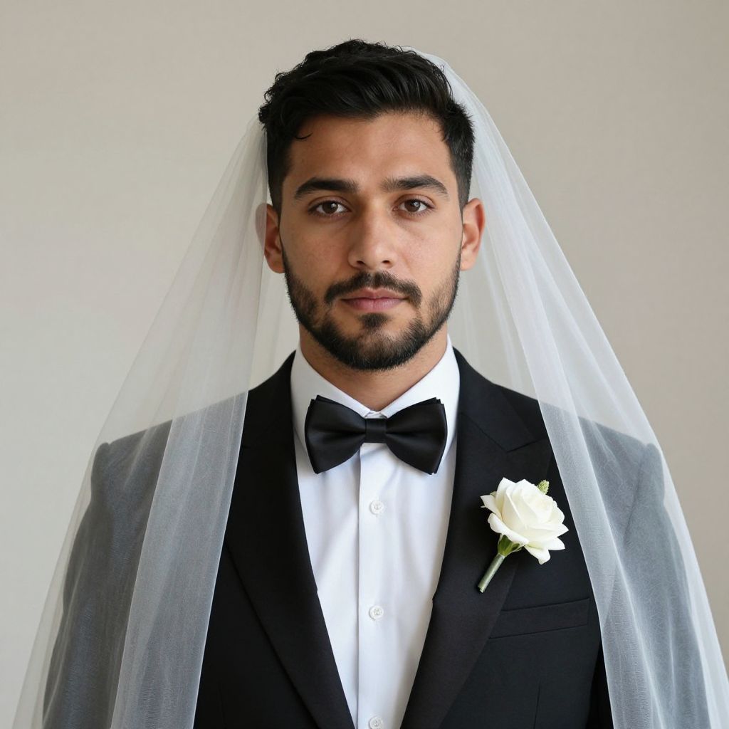 Photograph of a young South Asian man with medium brown skin and a trimmed black beard, wearing a black tuxedo with a white dress shirt and black bow tie. He has short, dark hair and is adorned with a white rose boutonniere on his left lapel. A white, sheer veil drapes over his head and shoulders. He gazes directly at the camera with a neutral expression. The background is a plain, light gray wall, emphasizing the subject. The lighting is even, highlighting the formal attire and veil.
