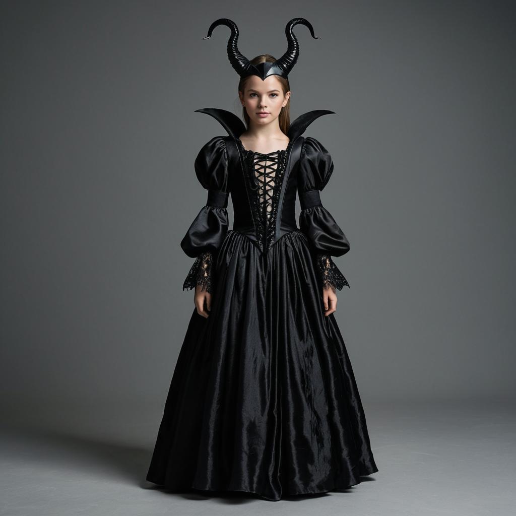 Girl black maleficent, photograph of young girl, standing, full body, wearing black gothic dress with puffed sleeves, intricate lace-up bodice, flowing satin skirt, black horned headpiece, light brown hair, serious expression, neutral gray background, studio lighting, fairy tale costume, child model, gothic fashion, elegant and mysterious, dark and moody atmosphere