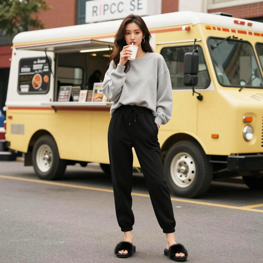A young woman with a pear-shaped body type stands in front of a yellow food truck at an urban food truck rally. She wears an oversized grey sweatshirt and black jogger pants paired with black furry slide sandals. She casually enjoys a drink from a white cup with a straw, exuding a relaxed and stylish vibe.