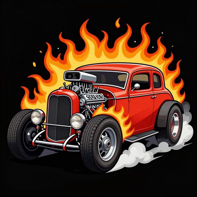 A vibrant vector illustration of a classic American Fifties-style hot rod funny car, featuring a big engine, dramatic flames, smoking tires, and a popping wheelie, rendered in bold, cartoonish detail with dynamic visual effects.