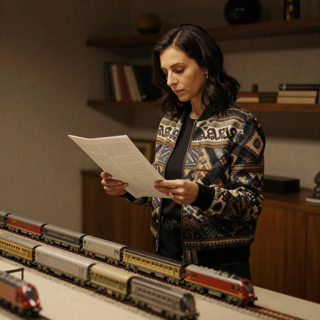 Woman with dark hair in patterned jacket, standing and reading a paper, in a dimly lit room. Table with detailed model train layout in foreground. Shelves with books and decorative items in background. Warm, yellow lighting. Casual, focused expression. One person.