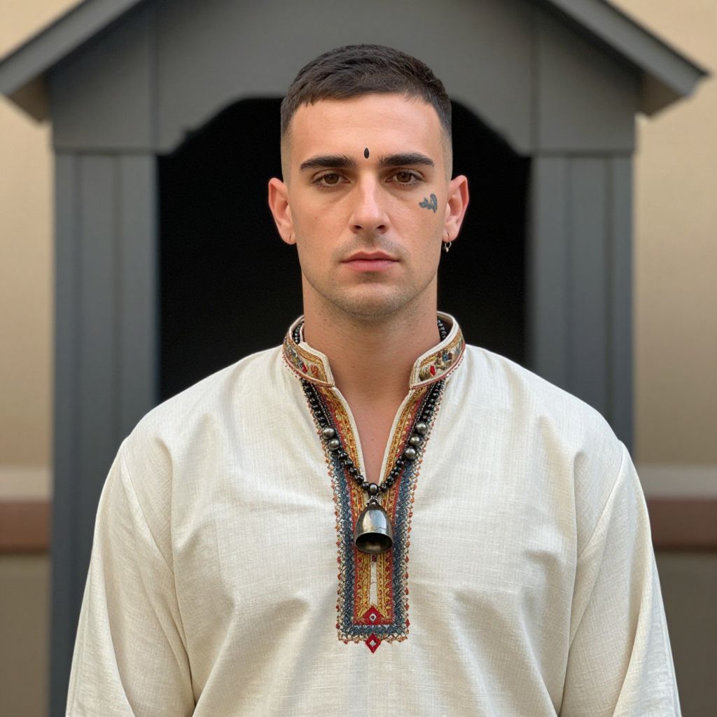 Photograph of a young man with short, dark hair and light skin, wearing a cream-colored, long-sleeved, embroidered traditional shirt with intricate black and red patterns around the collar and chest area. He has a small black star tattoo on his right cheekbone and a black dot on his forehead. He stands in front of a dark, arched doorway set into a beige building. The shirt's fabric has a subtle, textured pattern, and he wears a simple gold earring in his left ear. His expression is neutral, and he gazes directly at the camera.
