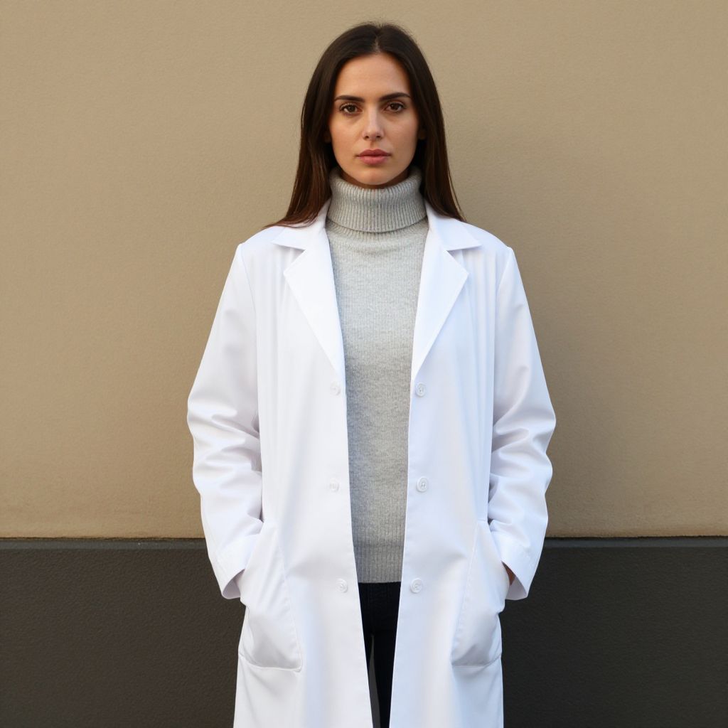 Photograph of a young woman with long, straight, dark brown hair and fair skin, standing against a beige and black wall. She wears a white lab coat over a light gray turtleneck sweater and black pants. Her hands are in the coat's pockets, and she has a neutral, slightly serious expression. The lab coat's fabric appears crisp and clean, contrasting with the soft texture of the turtleneck. The background is simple, emphasizing her outfit and expression. The lighting is even, highlighting her face and clothing.