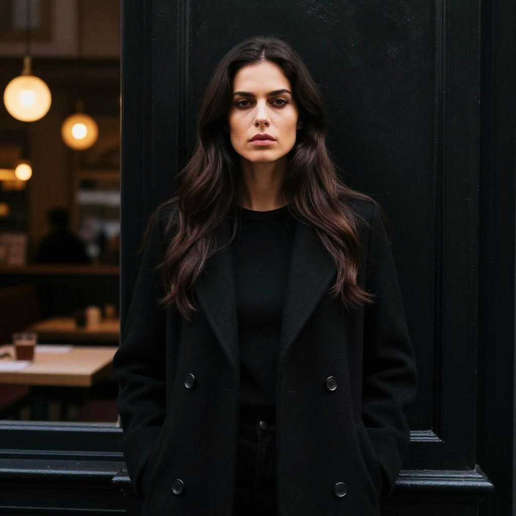 "White Coat Woman, woman in white coat and turtleneck sweater standing in front of a wall"