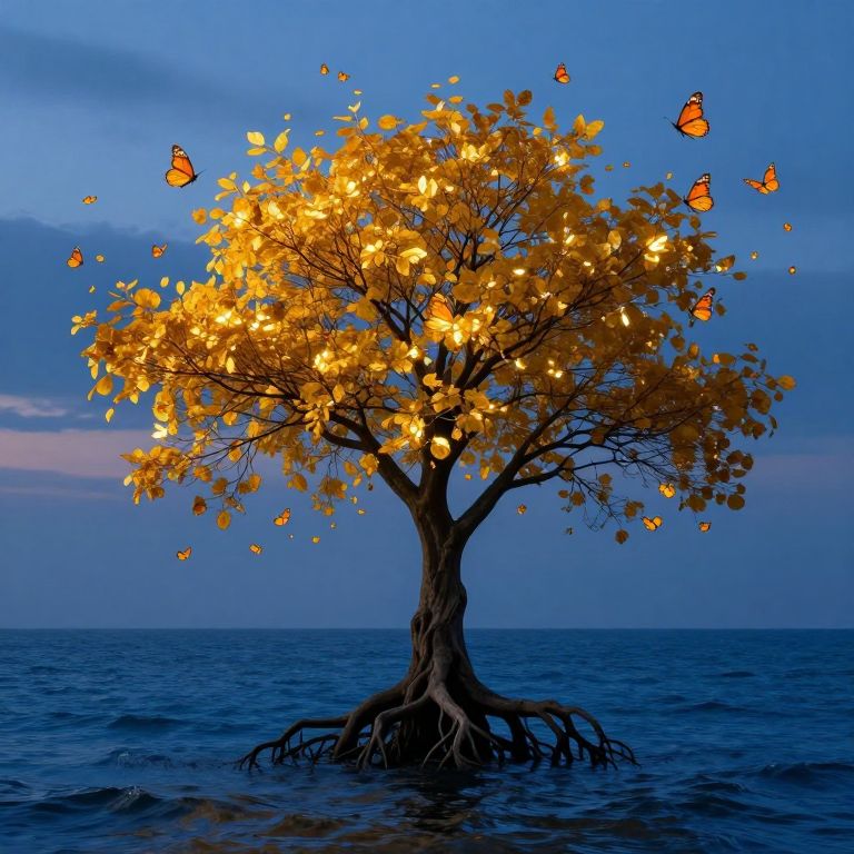 A digital illustration depicts a solitary tree with bright yellow, glowing leaves floating on a dark blue ocean. The tree's thick, gnarled roots extend into the water. Surrounding the tree are multiple orange and black butterflies, illuminated against a twilight sky with soft blue and pink hues. The scene combines surreal elements with a dreamlike, enchanting atmosphere. The tree's vibrant leaves and glowing effect contrast sharply with the calm, dark ocean and serene sky.