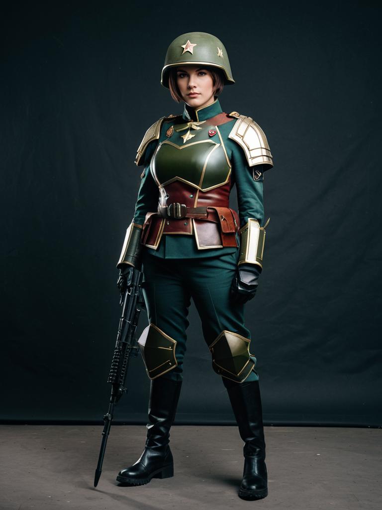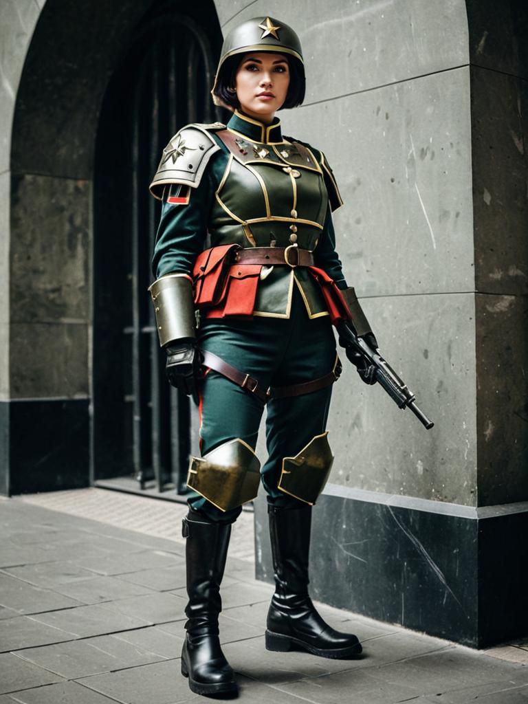 Photo-realistic cosplay photo of person in astra militarum costume. 1girl, short hair, medium breasts, military uniform, armor, helmet, military uniform. full body shot