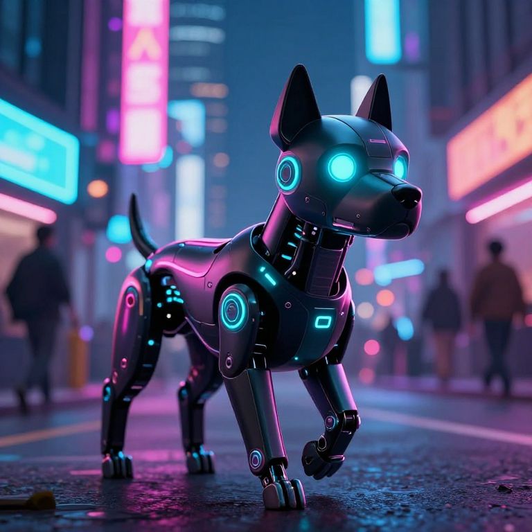 A CGI image depicting a futuristic, neon-lit robotic dog with a sleek, black metallic body and glowing blue circular lights on its ears, shoulders, and legs. The dog walks on a wet, urban street at night, illuminated by vibrant, colorful neon signs in pink, blue, and purple hues that line the buildings in the background. The blurred figures of pedestrians are visible in the distance. The scene has a cyberpunk aesthetic, with the robotic dog being the central focus, set against a bustling, neon-lit cityscape.