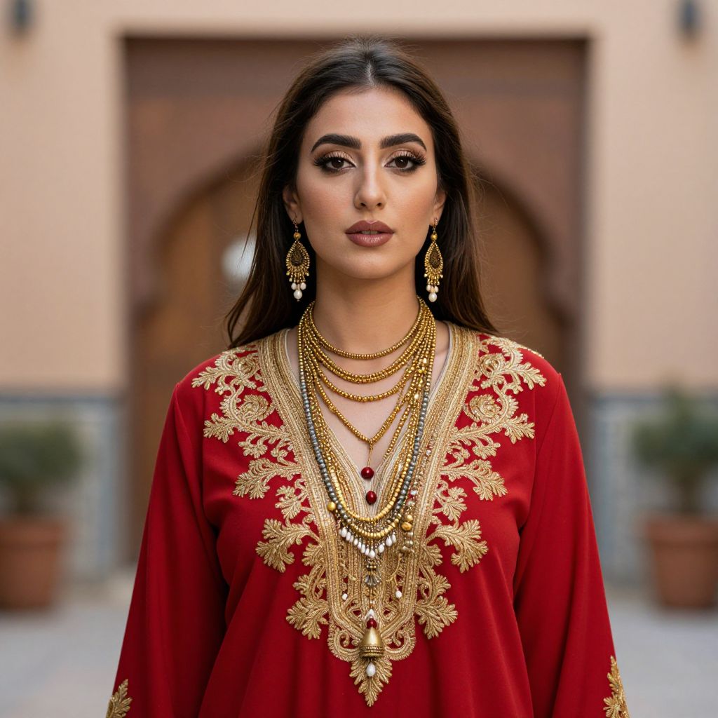 Woman wearing a vibrant red traditional outfit with intricate gold embroidery and beadwork, accessorized with dangling earrings and layered necklaces, stands gracefully against a blurred background of Fes architecture.
