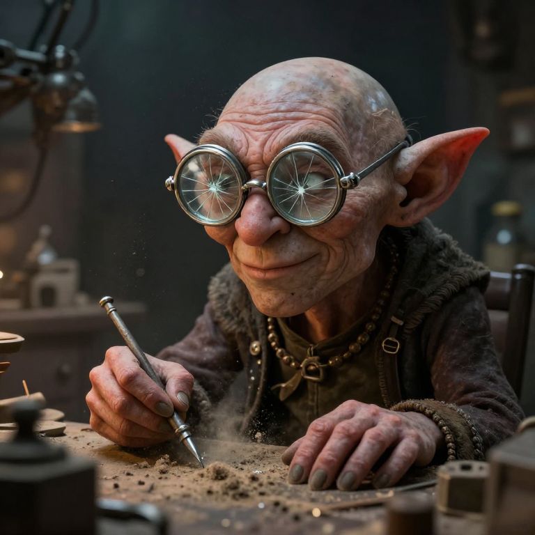 Goblin glasses with cracked lenses and twisted metal frames, worn by a crafty goblin inventor in a dimly lit underground workshop, dust particles in air