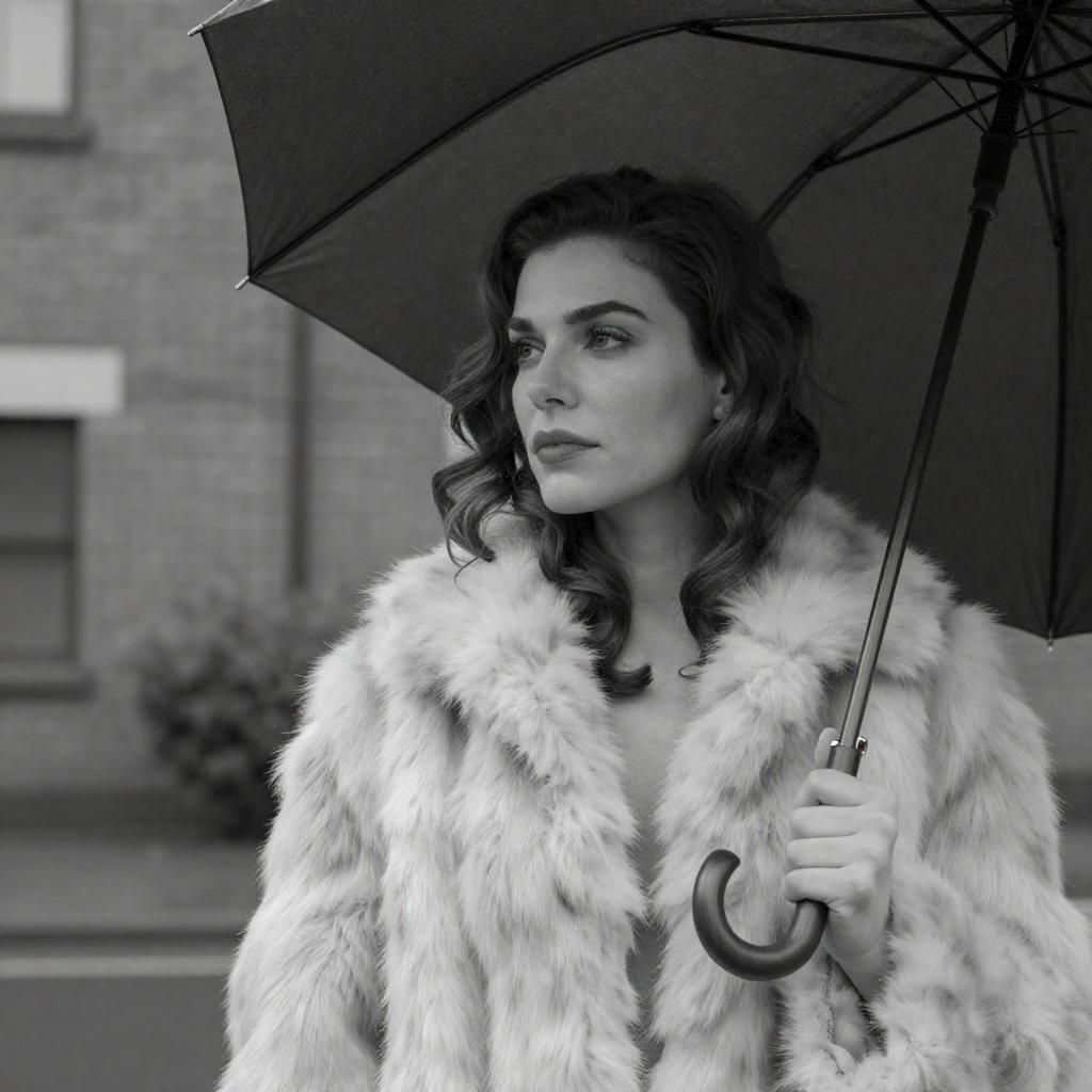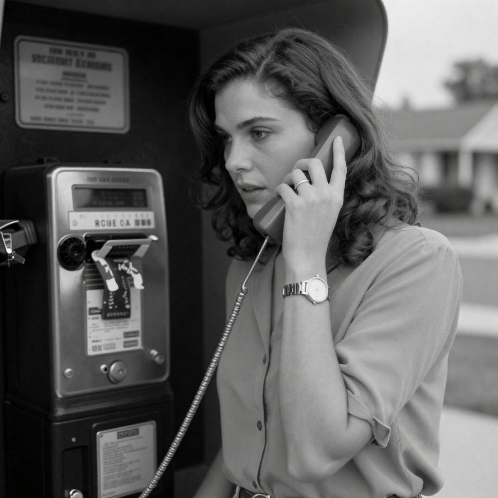 Black-and-white photograph of a woman with medium-length, wavy hair, wearing a blouse and ring, leaning against a payphone. She holds a corded phone to her ear with her right hand, wearing a wristwatch. Background includes a sign and suburban houses. Her expression is focused. Payphone has a visible slot with a package inside.
