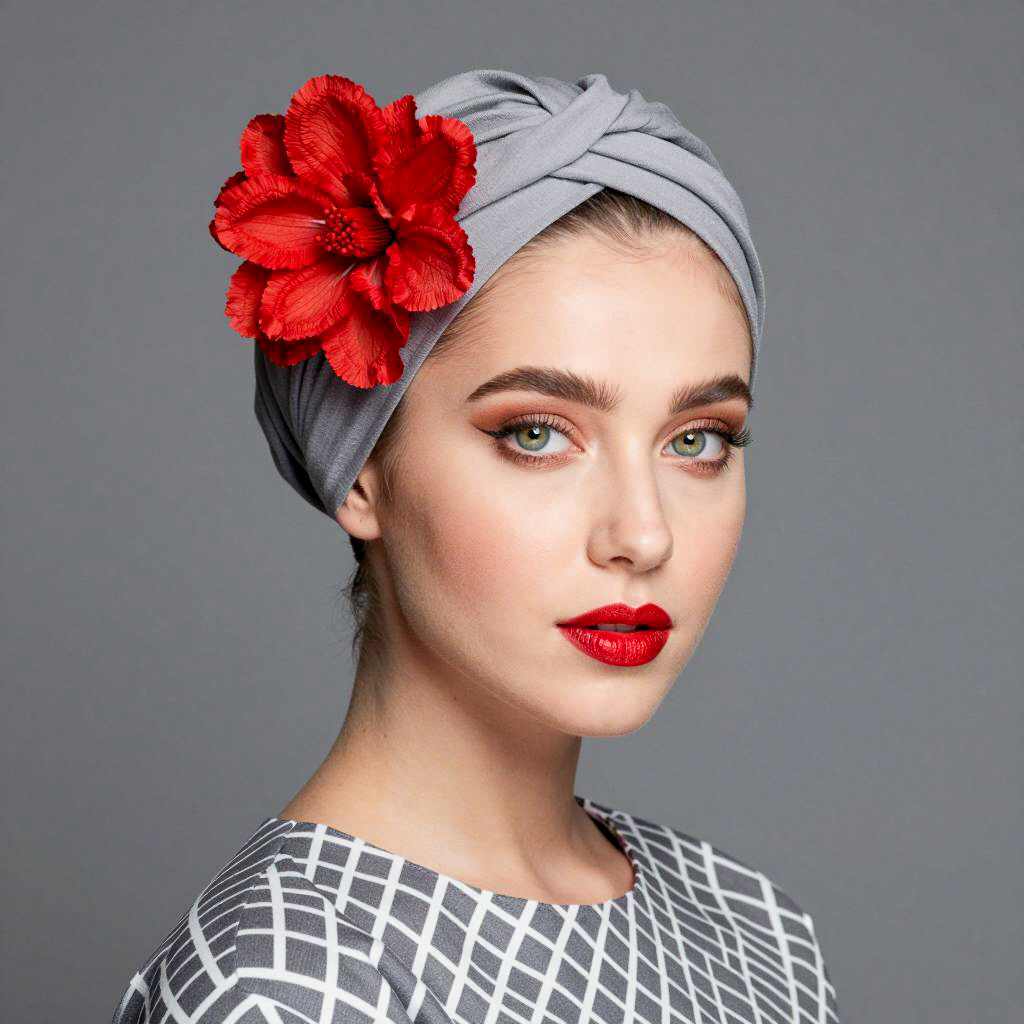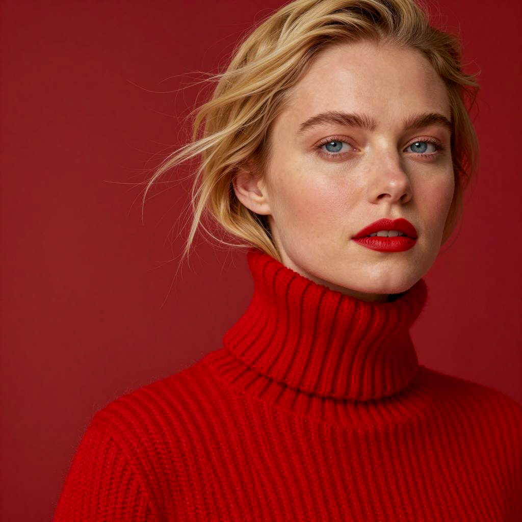 Photograph of a woman with pale skin, green eyes, and red lipstick. She wears a large, wide-brimmed red hat and a red, ribbed turtleneck. The background is a solid red. Her direct gaze is intense. The hat's wide brim partially obscures her right eye. The overall visual style is high fashion.