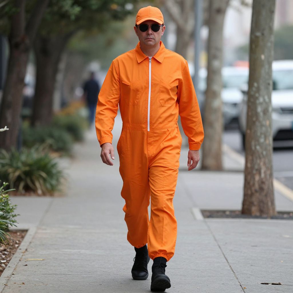 Orange Jump Suit Costume, man in an orange jumpsuit walking down a sidewalk