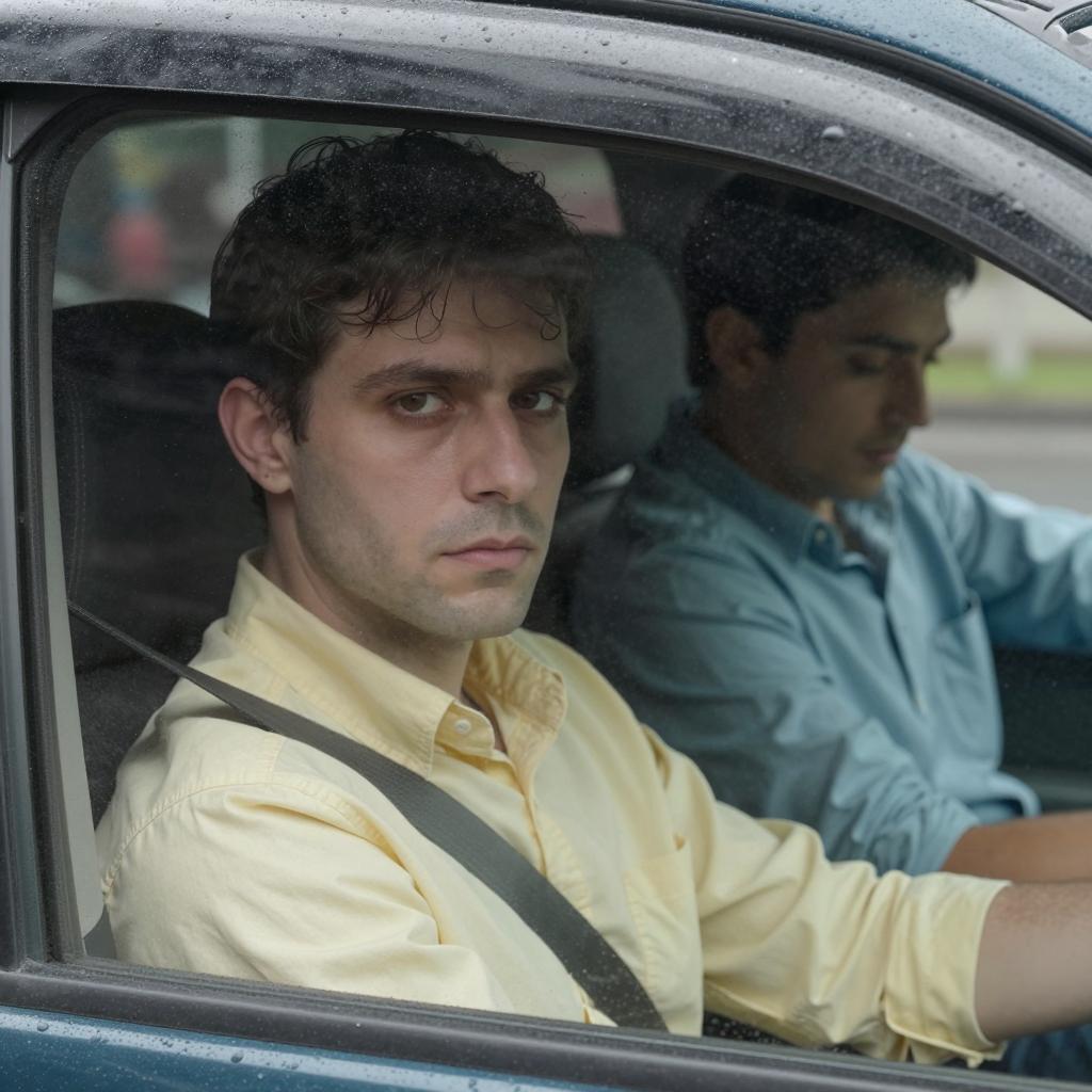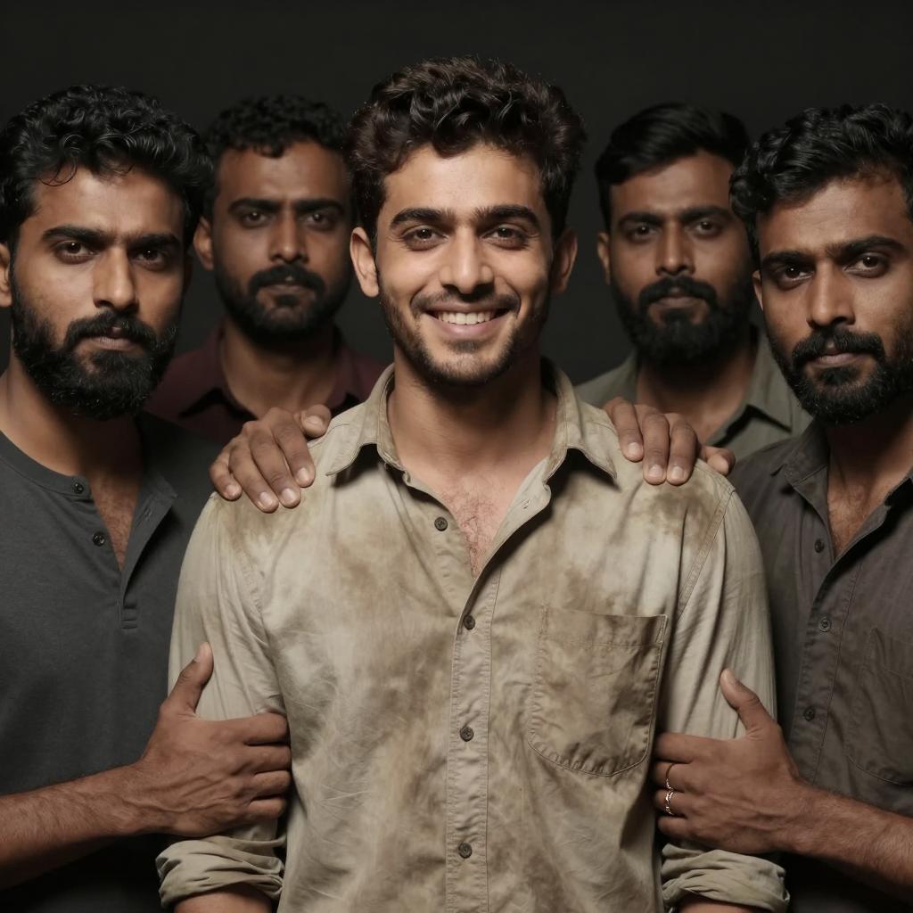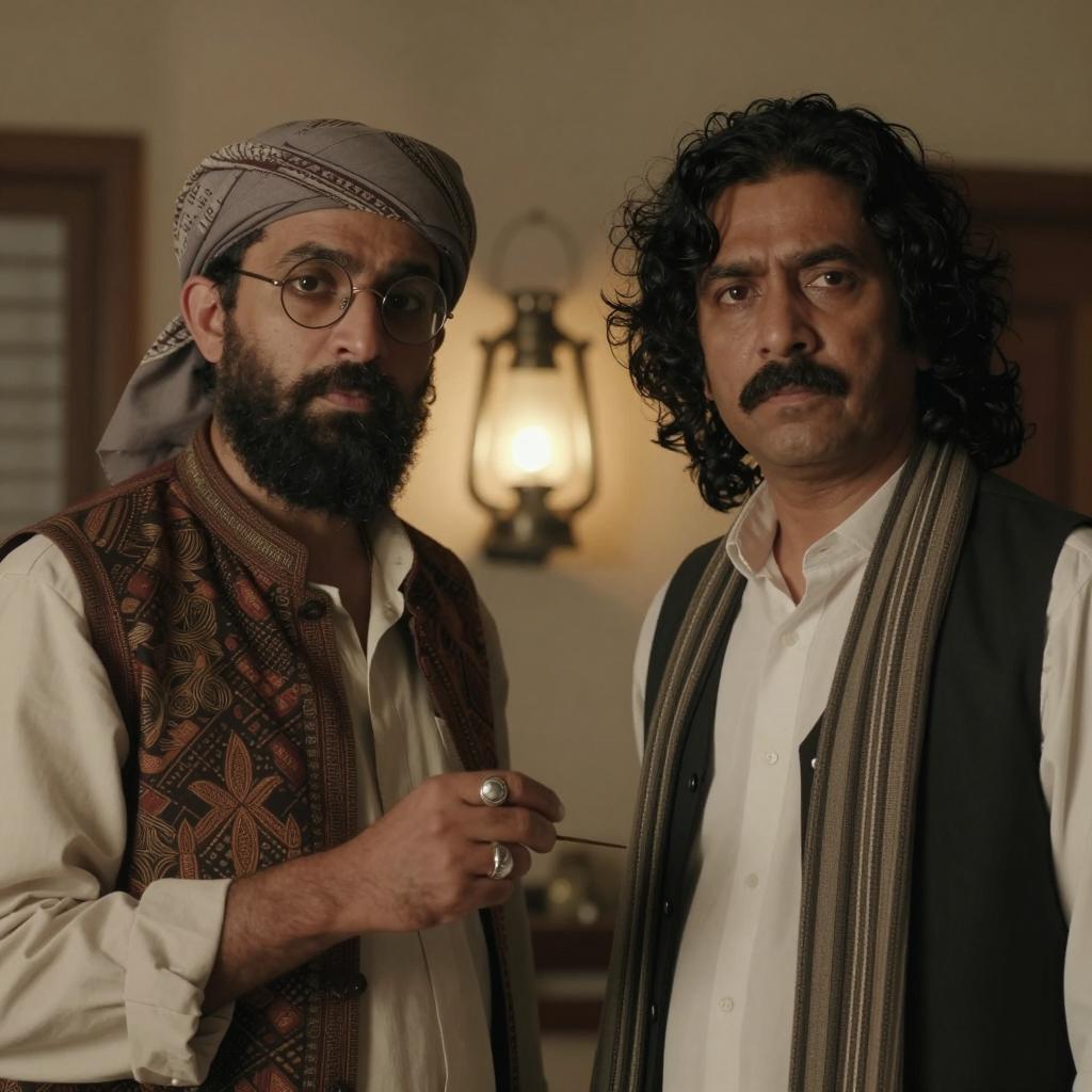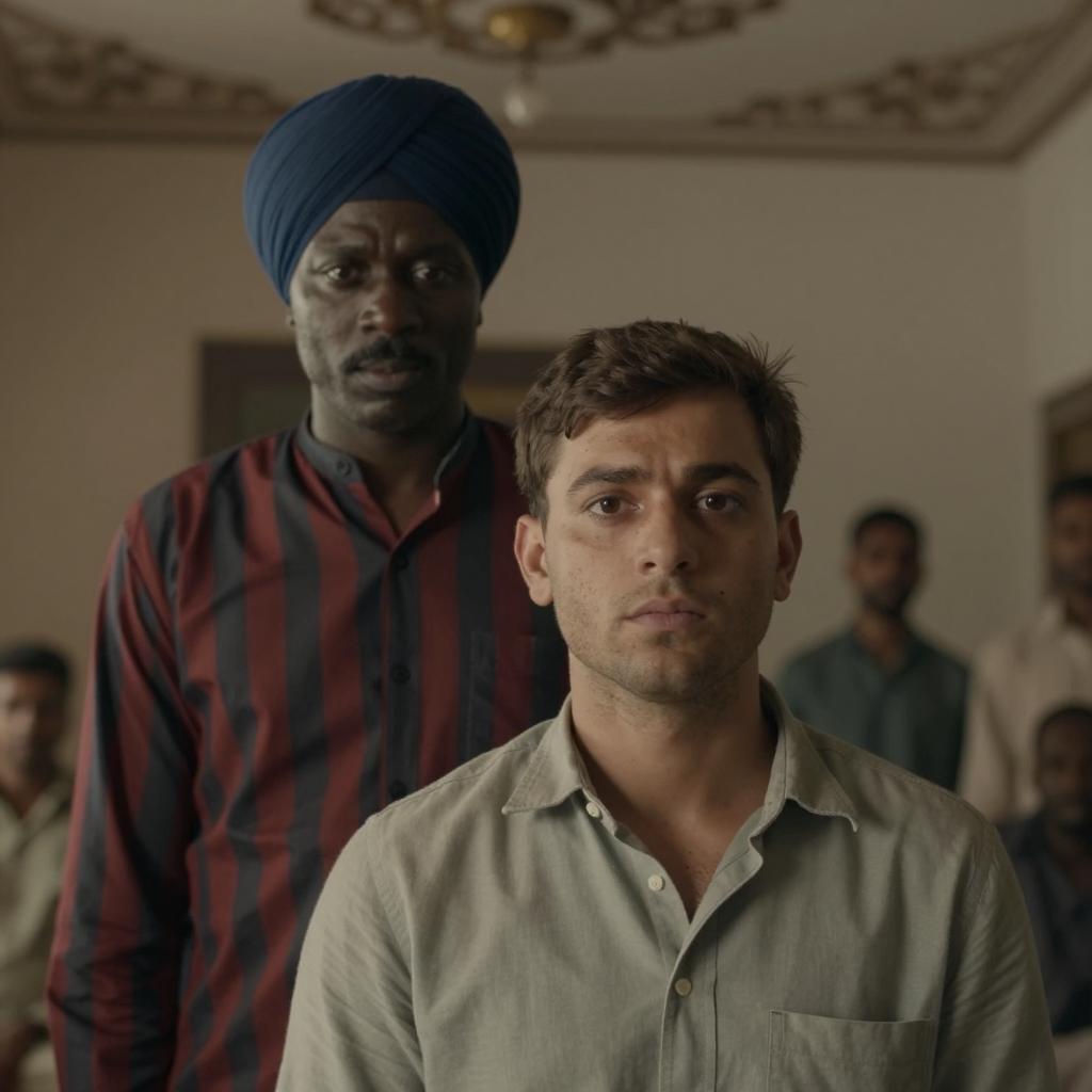 Two men in a dimly lit room. Foreground man with short brown hair, light green shirt, slightly open, looking forward. Background man with dark skin, blue turban, red and black striped shirt, mustache, leaning forward. Several blurred figures in the background. Ceiling with ornate design. Warm lighting.
