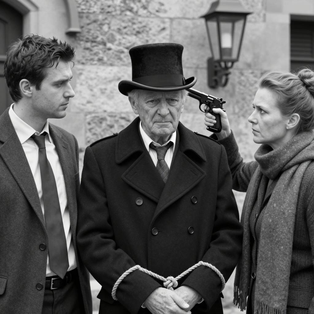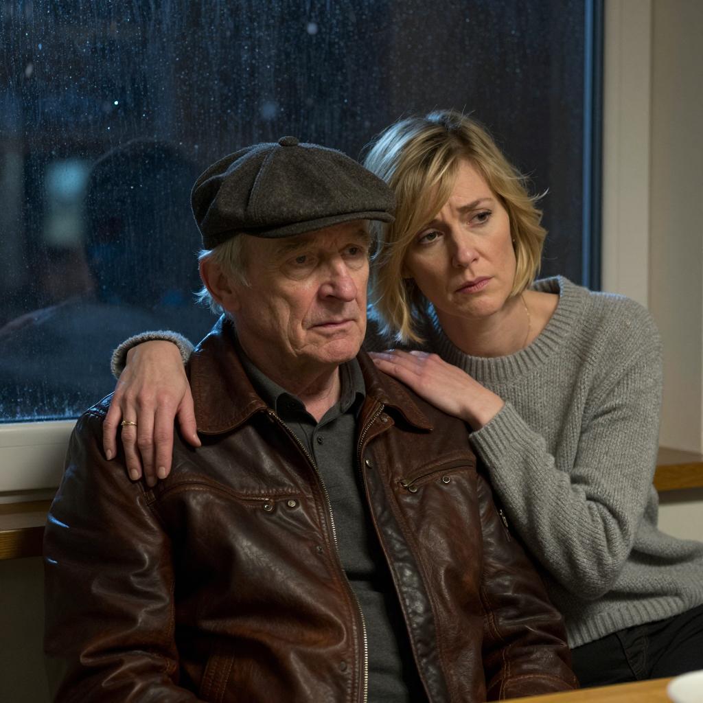 Two people indoors at night. An older man with gray hair, wearing a dark flat cap and leather jacket, sits in the foreground. A woman with short blonde hair and a gray knitted sweater leans on his shoulder from behind. Both look tired and concerned. Background shows a rain-streaked window with blue city lights. Snowflakes on the window. The man's right arm is in a black leather sleeve.