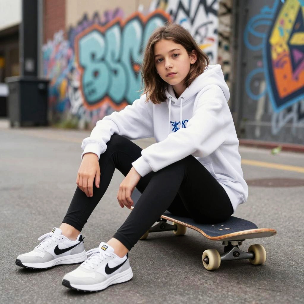 14 year old in leggings and oversized hoodie, sitting on a skateboard in a bustling city street, colorful graffiti walls, cool and relaxed vibe, urban streetwear style