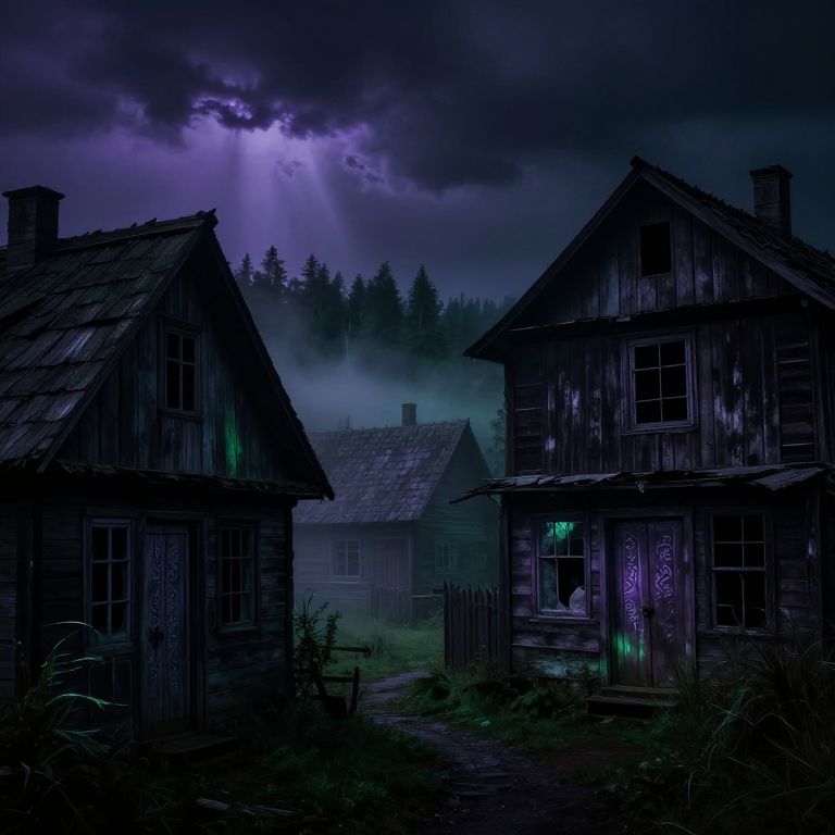 Dark fantasy village under a stormy sky, dilapidated timber-framed houses with broken windows, eerie purple and green hues casting unsettling shadows, mystical runes carved into wooden doors, fog rolling in from the nearby haunted forest.
