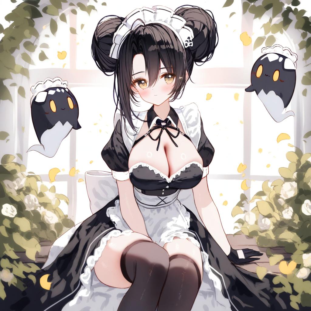 Agent (girls' frontline), girls' frontline, 1girl, maid, maid headdress, maid, hair between eyes, yellow eyes, black hair, asymmetrical hair, long hair, double bun, large breasts, medium breasts, cleavage, thighs, black gloves, black thighhighs, black dress, by artist pumpkinpan, animagine