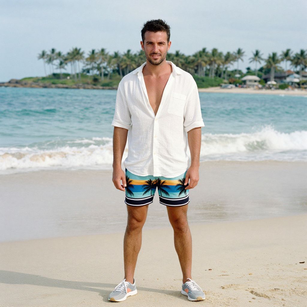 Photograph of a fit, tan-skinned man with short brown hair standing on a sunny beach. He is wearing a light blue, unzipped hoodie, revealing a toned, muscular chest and abdomen, and bright blue and orange striped swim trunks with navy blue stripes at the bottom. He has black sandals on his feet. The background features a sandy beach, clear blue ocean, and several tall palm trees with green fronds. The sky is partly cloudy with blue hues. The man stands in the center, facing the camera, with a relaxed yet confident expression.
