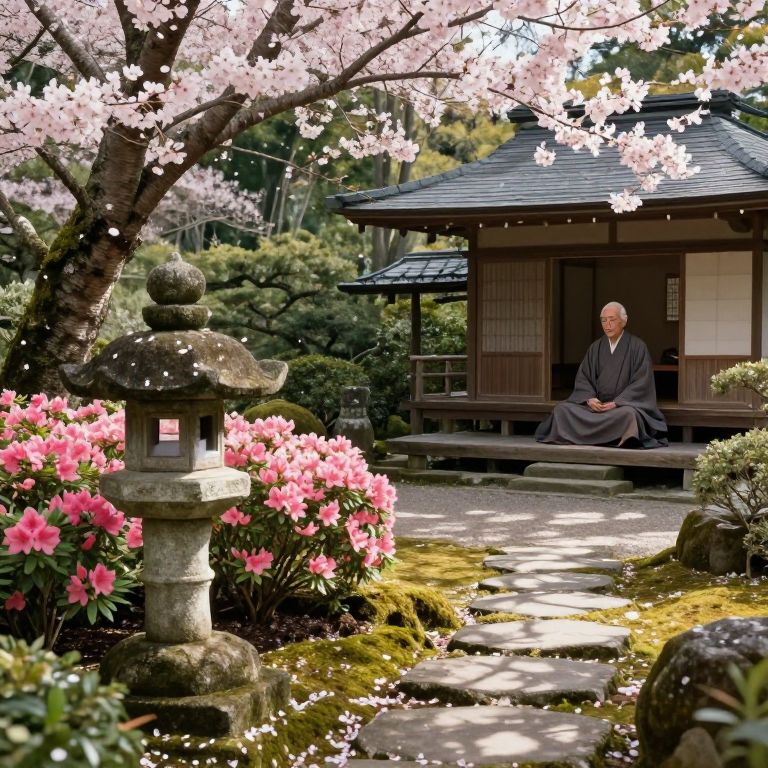 A serene Japanese garden captures the ephemeral beauty of spring in a tranquil style reminiscent of Utagawa Hiroshige's woodblock prints. Cherry blossom petals fall gently upon an ancient stone lantern nestled among lush azaleas, while light filters through slender trees casting dappled shadows across moss-covered stepping stones leading to a secluded tea house. In this peaceful panorama, a wise elderly monk sits in deep meditation, his weathered robes blending seamlessly with the surrounding nature, inviting viewers into a world of harmony and introspection that embodies the fleeting yet profound essence of Japanese aesthetics.