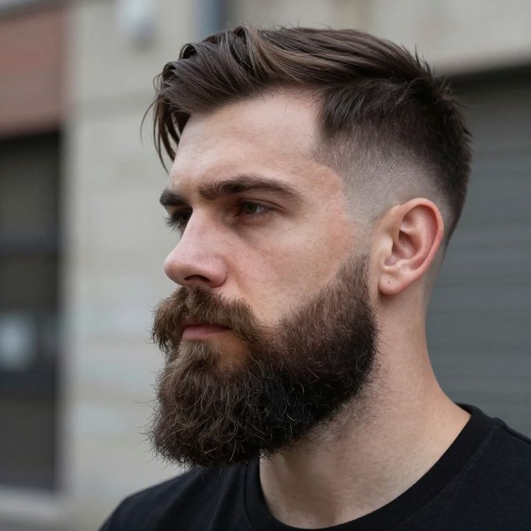 Photograph of a young Caucasian man with a fair complexion and a well-groomed, thick, dark brown beard and mustache. He has a short, undercut hairstyle with the sides closely shaved and the top styled upwards. He is wearing a plain black shirt. The background is blurred, featuring a gray building with a black window and a light-colored wall. The man's expression is serious, with his eyes slightly squinted and looking to the right. The image has a high contrast and sharp detail, highlighting the texture of his beard and hair.