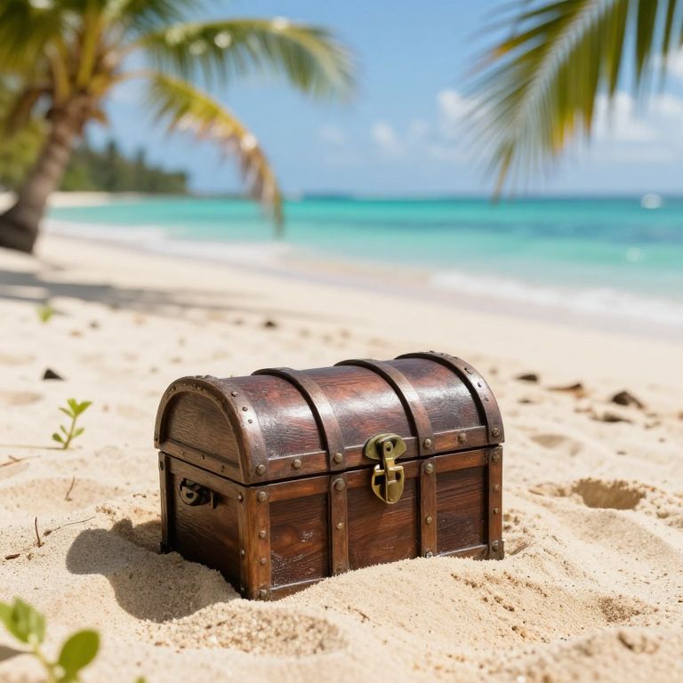Burying a treasure chest on a sunlit tropical beach, sparkling turquoise water in the background, palm trees swaying gently, detailed sand grains, vibrant and colorful, adventurous mood