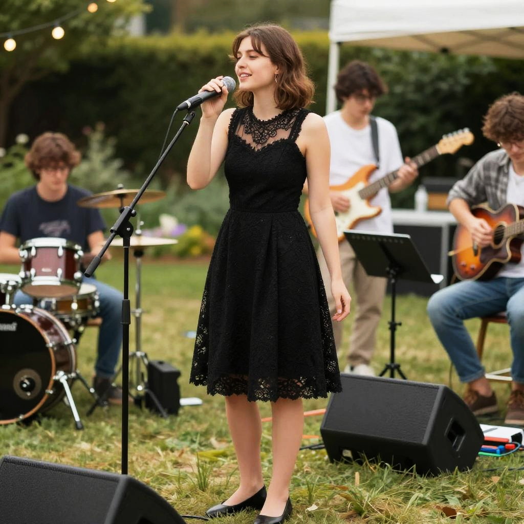 A Svelte woman in a modern chic black lace skater dress with a sheer mesh yoke, simple black flats, enjoying live music at a garden party, in the vibrant visual style of Shueisha. Sexy. Pretty face and beutiful eyes