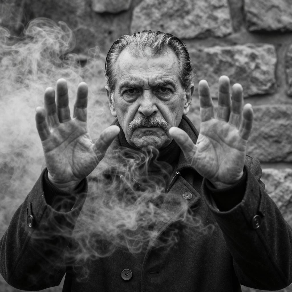 Black and white photograph of an elderly man with a mustache, slicked-back hair, wearing a dark coat and turtleneck, hands raised in front, fingers spread wide, surrounded by thick smoke. Stone wall background. Man's expression is intense. Smoke fills lower half of image.