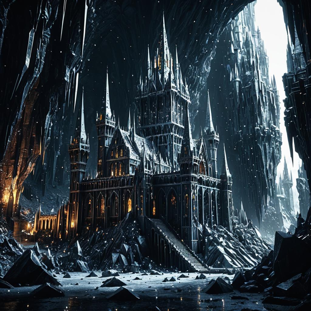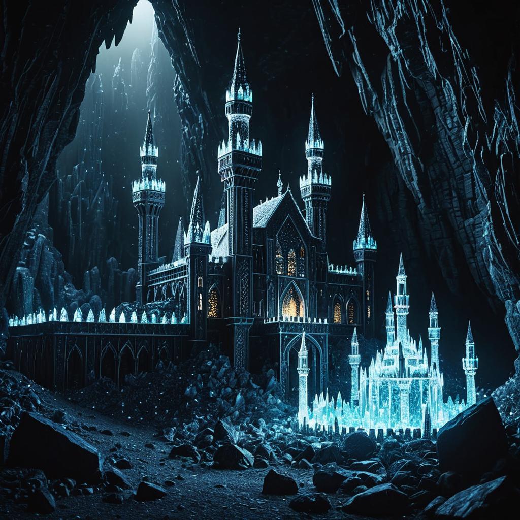 Enchanted iron age citadel made of opaline crystals in a nebula-lit vast dark cave. Features a buttressed castle and conical towers, iridescent aura and glowing, Octane render, 8K, ultra-realistic, magical atmosphere