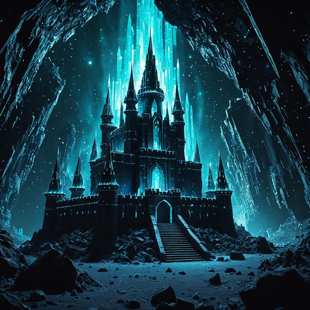 Ultra-realistic digital rendering of an enchanted iron age citadel made of opaline crystals, located inside a vast dark cave illuminated by nebula light. The castle features buttressed walls and numerous conical towers, glowing with an iridescent blue aura that enhances its magical atmosphere. Surrounded by rocky terrain with a grand staircase leading to the entrance, set in a mysterious and mystical environment.