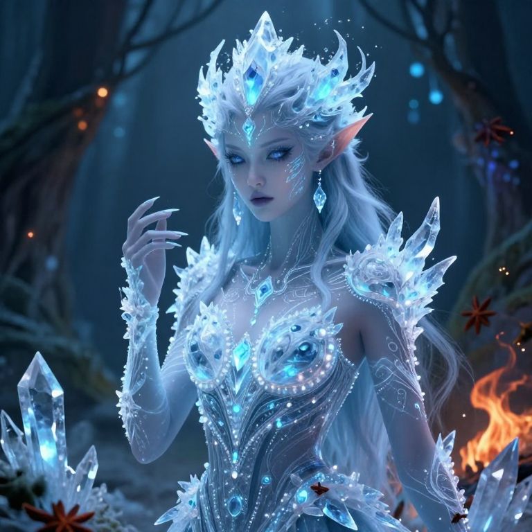 Digital artwork of a glowing, ethereal elf woman with white hair, ice-like crown, and crystal armor, standing in a dark, enchanted forest with
