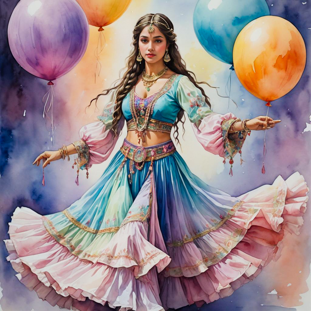 Watercolor painting of a young slender woman with long braided hair wearing a traditional belly dancer outfit featuring a pastel blue frock with balloon sleeves and a foamy, layered petticoat in soft pastel colors. She is adorned with traditional jewelry and surrounded by pastel-colored balloons against a watercolor background.