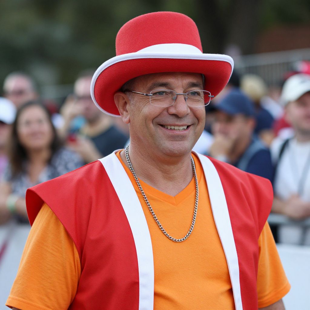 A cheerful, middle-aged man with a friendly smile is wearing a vibrant red, white, and orange costume, complete with a matching red and white hat. He has glasses perched on his nose and a noticeable necklace around his neck. In the background, there are blurred spectators in the stands, suggesting a lively event.