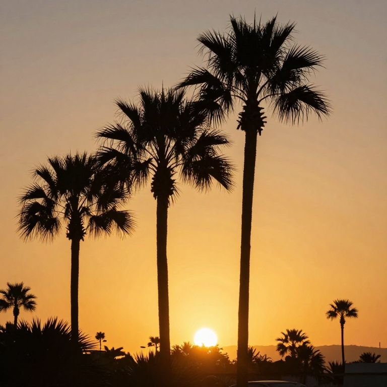 Serenity and freedom intertwine as the silhouettes of palm trees stand tall against the fiery embrace of a setting sun, casting a warm, golden glow that whispers of peace and the timeless rhythm of nature.