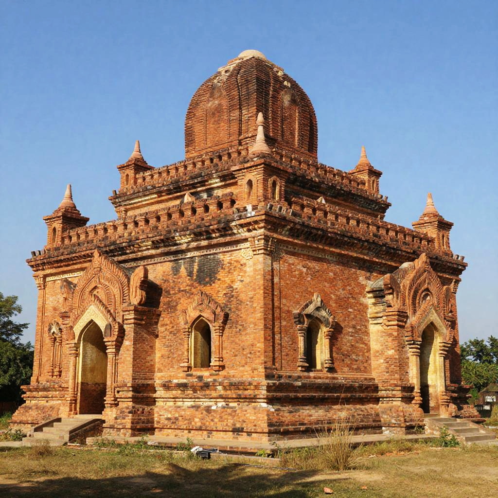 Photograph of an ancient, red-orange brick temple with intricate carvings and a dark, dome-shaped roof. The temple stands in a grassy, slightly overgrown area with some trees in the background. The bright blue sky provides a clear contrast to the temple's warm colors. The structure has multiple small spires and arches, giving it a rich, historical feel.