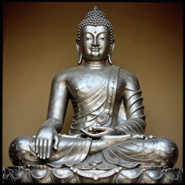 Photograph of a serene, silver Buddha statue in a meditative lotus position, with detailed facial features and a draped robe, against a brown gradient