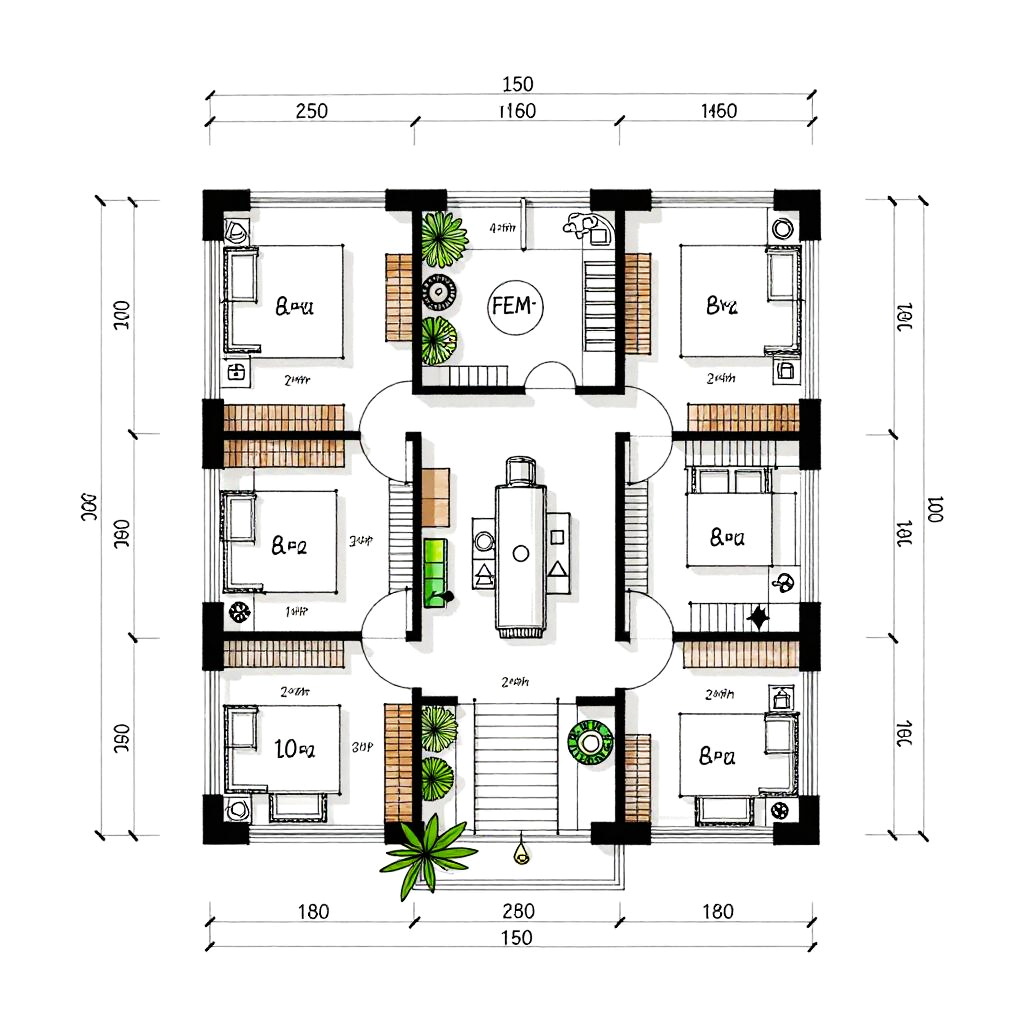 Skyscraper floor plan hand-drawn style, showing mixed-use layout with residential and commercial spaces, communal areas, plants, elevators, stairs, with dimensions and annotations