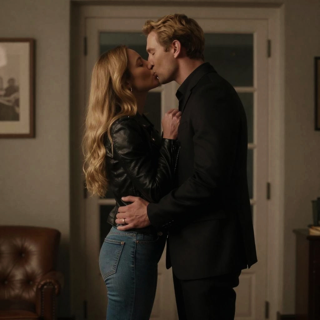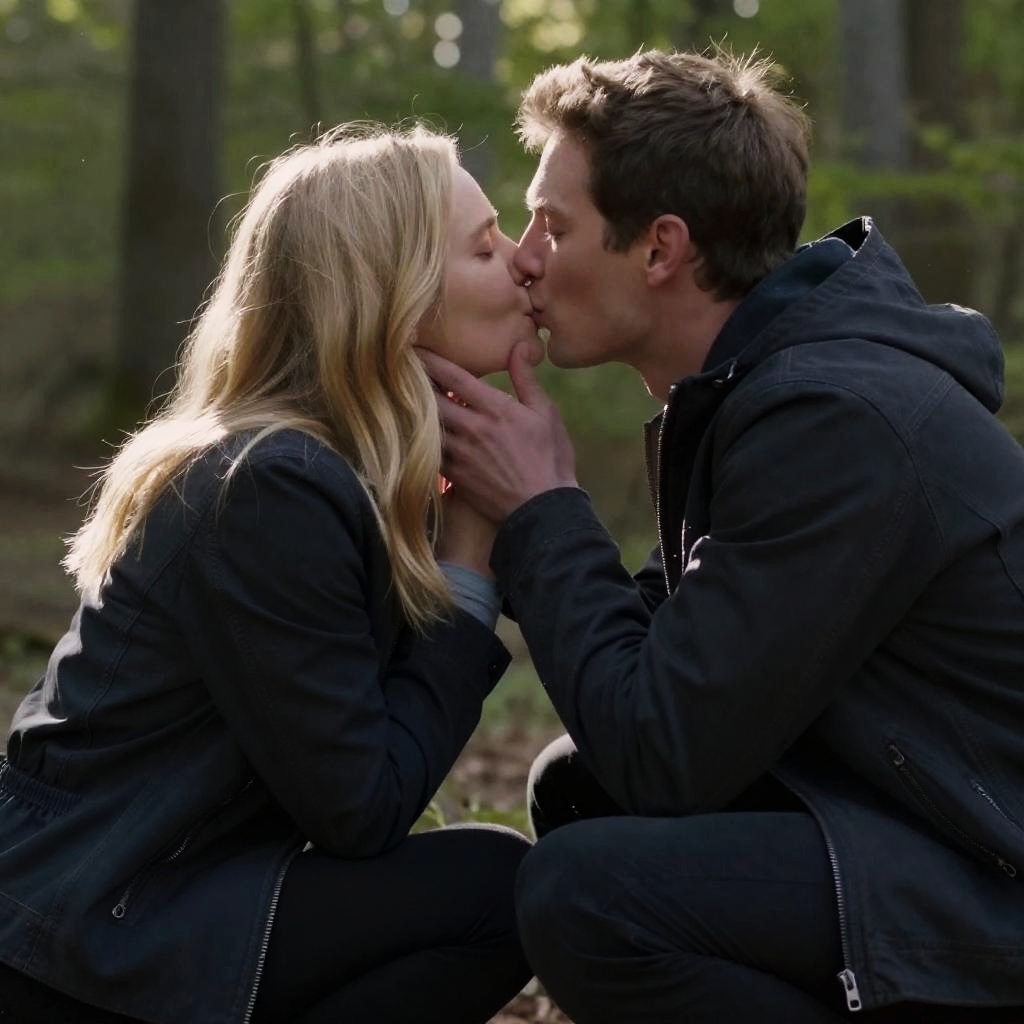 Photograph of a couple sharing a gentle kiss outdoors. The blonde woman is wearing a geometric patterned dress with thin straps, and the man is dressed in a black suit and white shirt, holding her face tenderly. The background features blurred figures, green trees, and a white tent, set in daylight with casual attire visible.