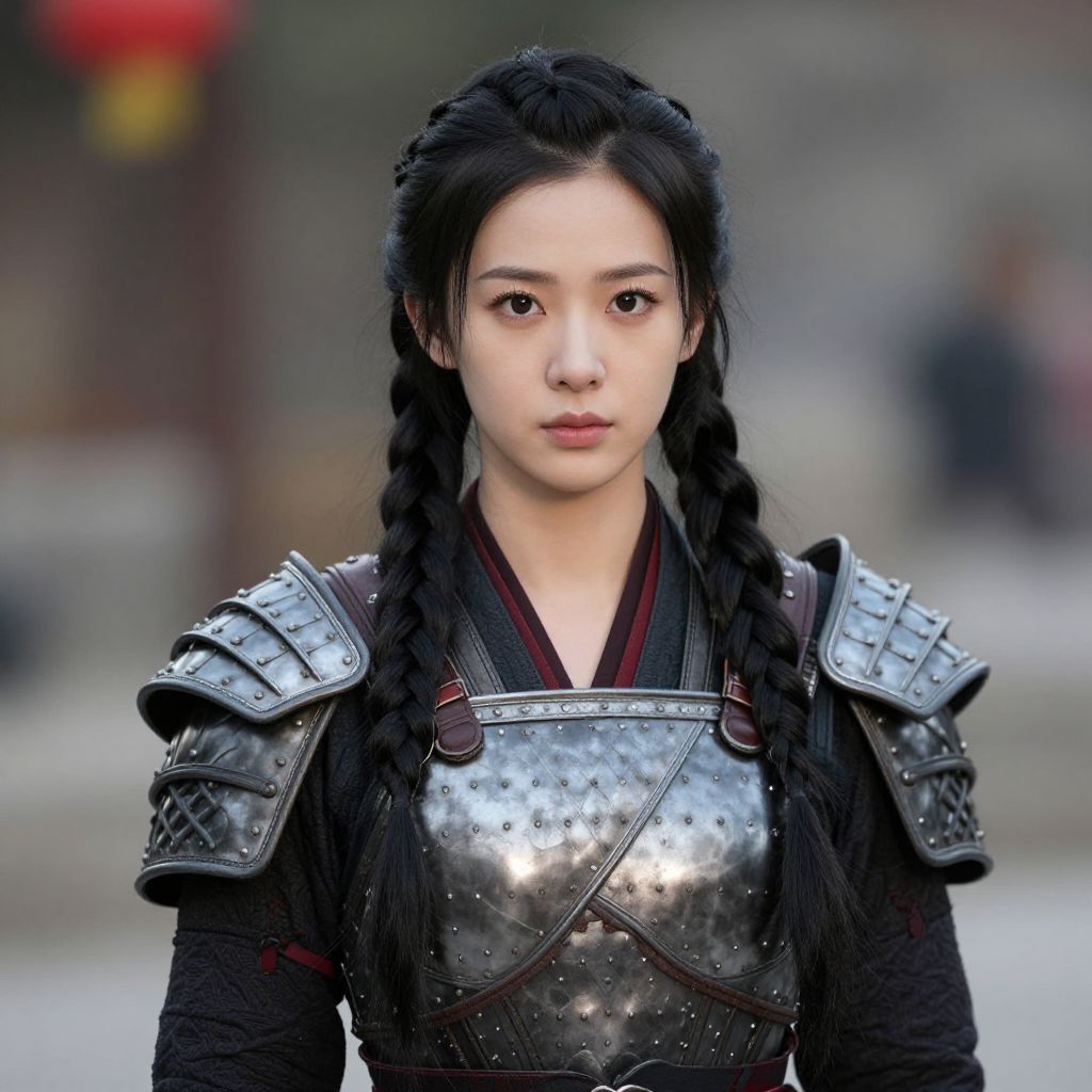 Photograph of an East Asian woman with fair skin and black braided hair, wearing medieval-style silver armor with decorative studs and black fabric underneath. Her expression is neutral, and she stands against a blurred background featuring muted colors and indistinct shapes. The armor's shoulder pieces are prominent, and the light reflects off the metallic surface. The woman's attire and serious gaze evoke a warrior-like appearance, blending historical and fantasy elements. The image has a realistic, cinematic quality.