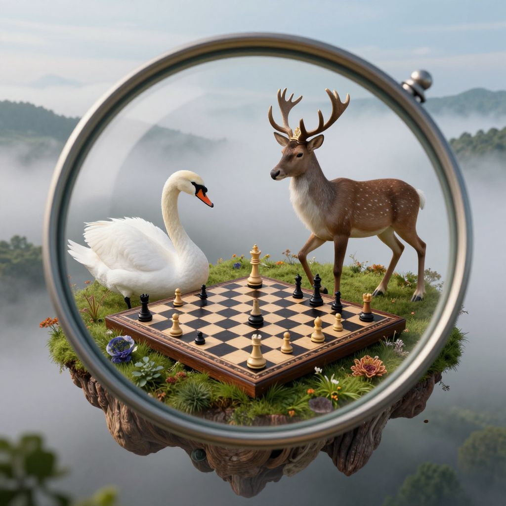 Photorealistic CGI image showing a magnifying glass centered on a floating chessboard with black and white pieces, positioned on a grassy cliff. A white swan with an orange beak stands to the left of the board, while a brown deer with antlers stands to the right. The background features a misty, mountainous landscape. The chessboard is adorned with small flowers, and the magnifying glass has a metallic frame. The image blends surreal and realistic elements, creating an imaginative, whimsical scene.