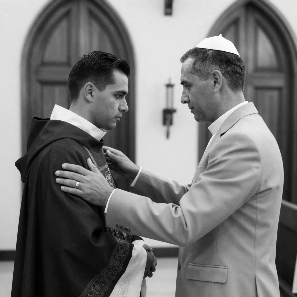 Black-and-white photograph of two men in a church setting. One man in a light suit and clergy cap assists another in a dark, ornate robe. Both have short, slicked-back hair. The assisting man's hand is on the other's shoulder. The background has arched, wooden church doors. The second man's expression is neutral. The first man looks attentive. Both men stand close together.