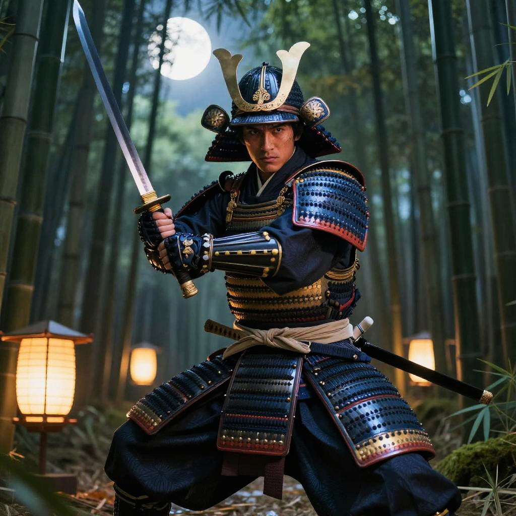 Tanigaki portrayed as an ancient samurai warrior, poised with a katana blade, intricate armor details shining under moonlight, dense bamboo forest backdrop with flickering lanterns, intense focused expression and powerful stance, evoking strength and honor.