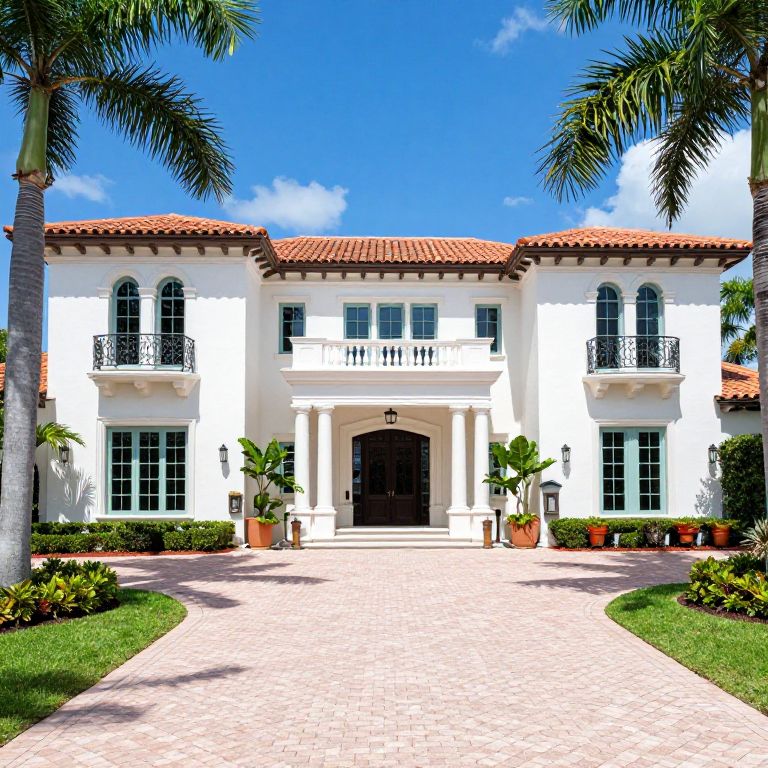 Imposing Mediterranean-style mansion 'La Follia,' featuring a grand entrance with columns, arched balconies, and terracotta roofing, stands as the most expensive home in Palm Beach, surrounded by lush landscaping and a pristine brick driveway.