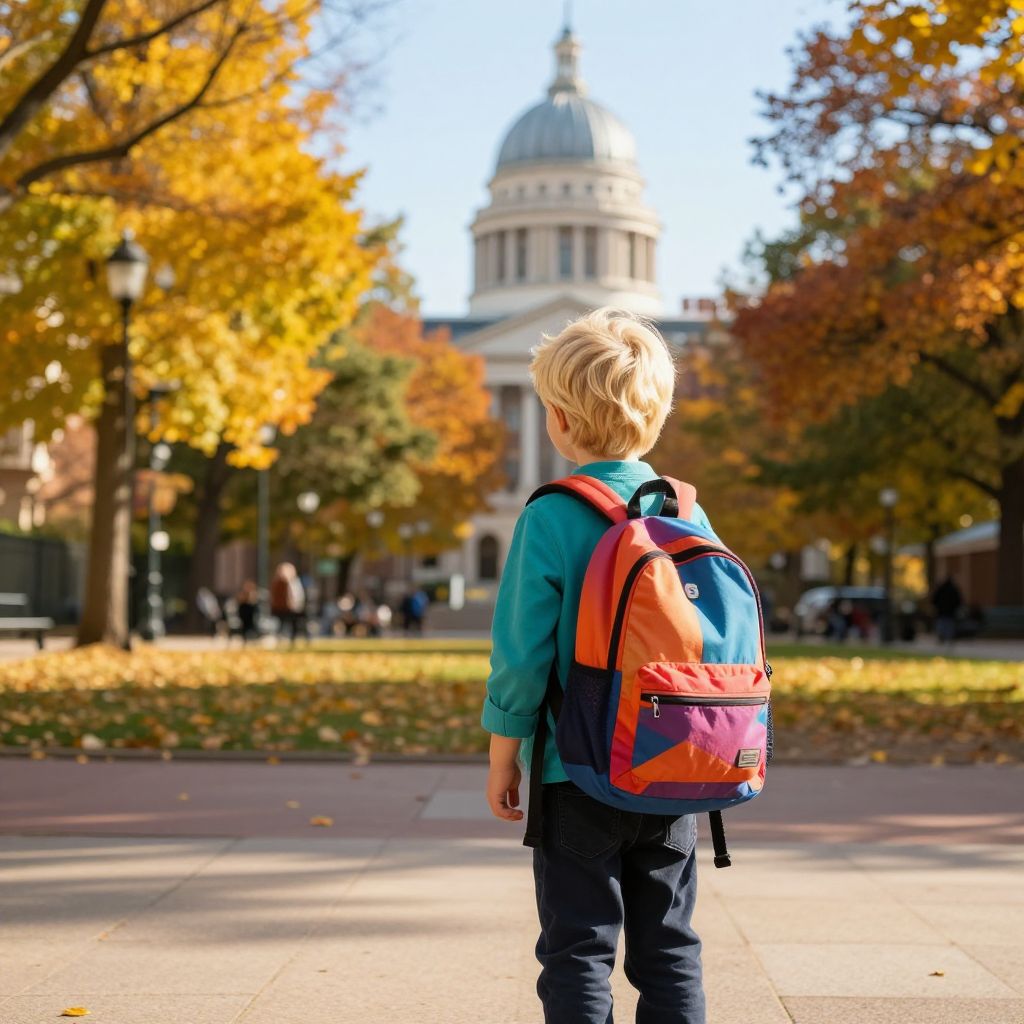 A young blonde boy stands in a sunlit urban park during autumn, wearing a vibrant multicolor backpack. He is dressed in a teal shirt and dark pants. The scene features fall foliage with yellow and orange trees and showcases a historic building with a domed roof in the background, suggesting a city or university campus setting.
