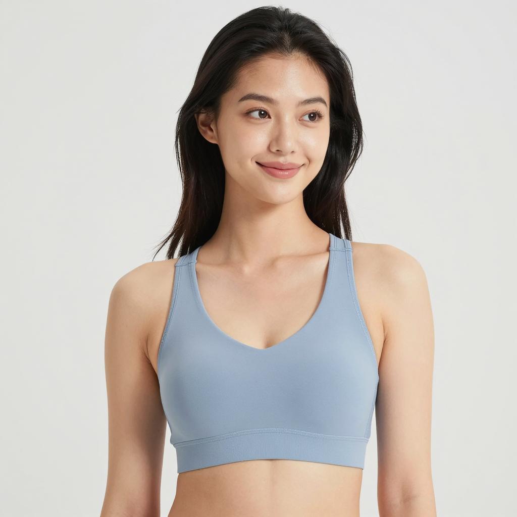 Photograph of a young woman with long, wavy black hair, light brown skin, and a smile. She wears a light blue, floral-patterned sports bra. She is facing the camera, slightly turned to the right. Her right arm is relaxed by her side, and her left arm is partly visible. White background. Upper body shot.